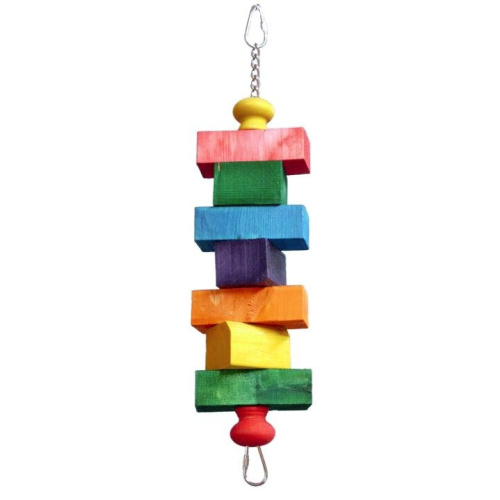 Studies have shown that toys play a critical role in keeping exotic birds healthy. The Zoo-Max Cheapo bird toy is designed to stimulate your bird. Brightly colored wooden squares on a smooth welded chain make this bird toy great chewing fun for medium-sized birds.