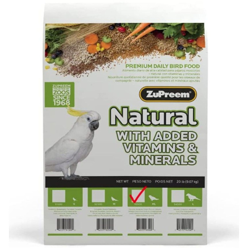 ZuPreem Natural Blend Bird Food - Parrot & Conure - 20 lbsZuPreem Natural with added vitamins, minerals and amino acids provides healthy and delicious nutrition for everyday feeding for Conures, Caiques, African Greys, Senegals, Amazons, Eclectus, Small Cockatoos and other medium to large parrots that prefer this pellet size.